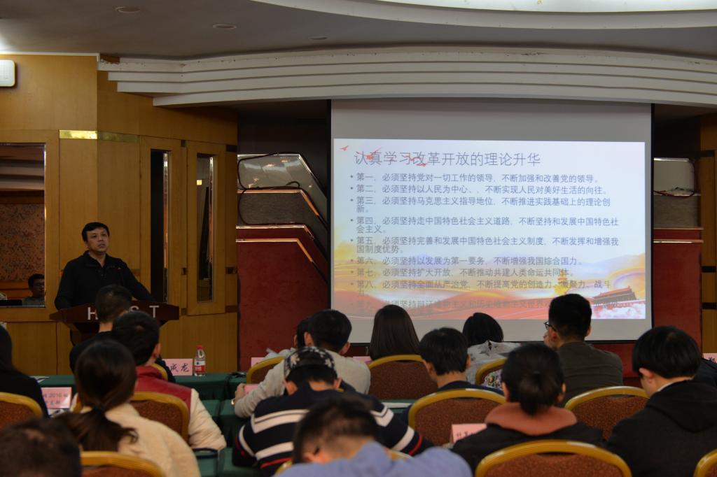 学院党委副书记郑强布置了学习工作。他要求学院各党支部、班团组织和习近平新时代中国特色社会主义思想学习小组立即行动起来,按照学校和学院党委的统一要求,认真学习阅读讲话原文,从“深刻认识改革开放的历史必然性,掌握马克思主义的历史唯物主义和辩证唯物主义”、“深刻认识改革开放的伟大成就,坚定“四个自信”、“深刻认识改革开放的理论升华,学习好习近平新时代中国特色社会主义思想”、“深刻认识改革开放的伟大昭示,立志为实现中华民族伟大复兴而奋斗”四个方面把握讲话的精神,扎实开展好讲话精神的学习宣传。