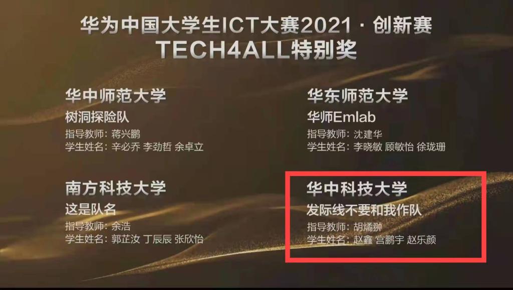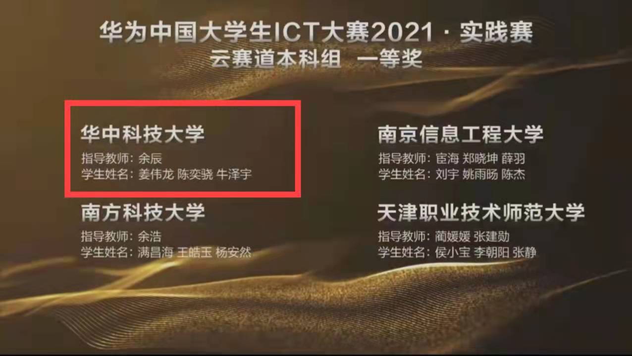 12月25日,华为中国大学生ICT大赛2021落下帷幕,我院余辰教授指导的2019级本科生姜伟龙、陈奕骁、牛泽宇团队获得实践赛云赛道本科生组一等奖,胡燏翀教授指导的2019级本科生赵鑫、宫鹏宇、赵乐颜获得创新赛TECH4ALL特别奖。