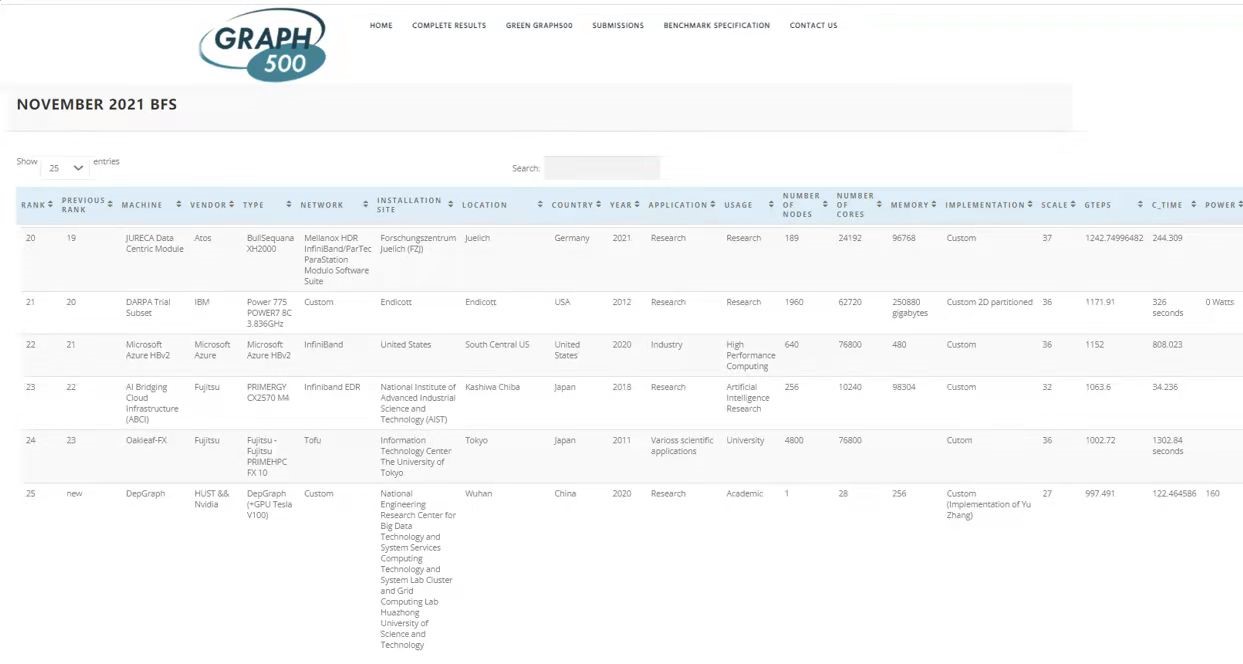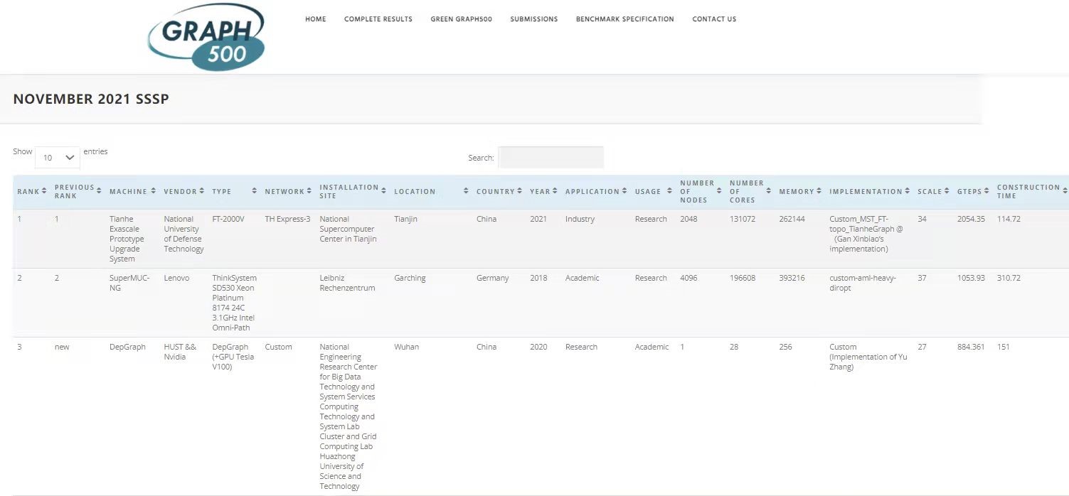 2021年11月18日,在美国圣路易斯举办的国际超级计算大会上,第18届Green Graph 500和第23届Graph 500排名揭晓,我校云博网页版大数据技术与系统国家地方联合工程研究中心、服务计算技术与系统教育部重点实验室曁集群与网格计算湖北省重点实验室图计算团队研发的图计算机DepGraph在Green Graph 500排名中,性能功耗比全球第一,达到6234.32MTEPS/w;同时在Graph 500排名中,单机性能全球第一,对于SSSP和BFS两个应用分别达到884.361GTEPS和997.491GTEPS。