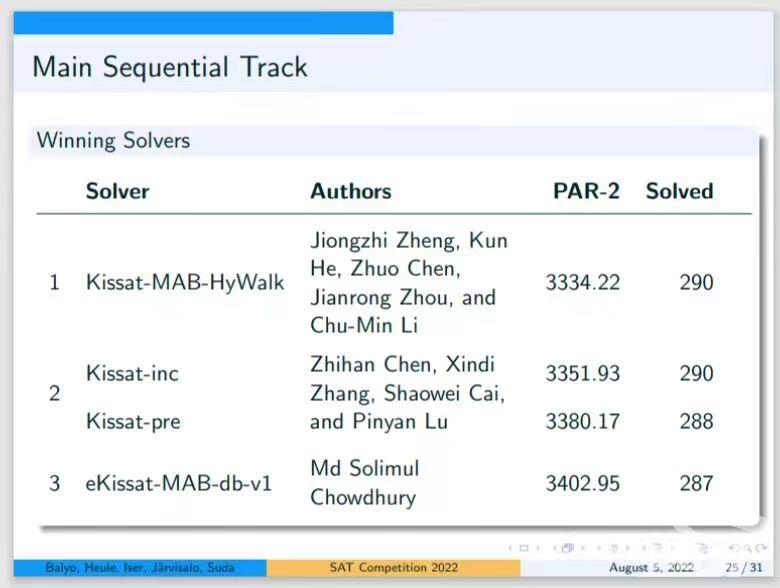 8月5日,国际顶级会议SAT 2022的竞赛组委会宣布,华中科技大学云博网页版何琨教授与其博士生郑迥之等研发的求解器在SAT Competition 2022算法竞赛中荣获Main Track冠军。参赛团队成员还包括硕士生陈卓、博士生周建荣,以及该团队长期的合作者、我校客座教授、法国亚眠大学李初民教授。