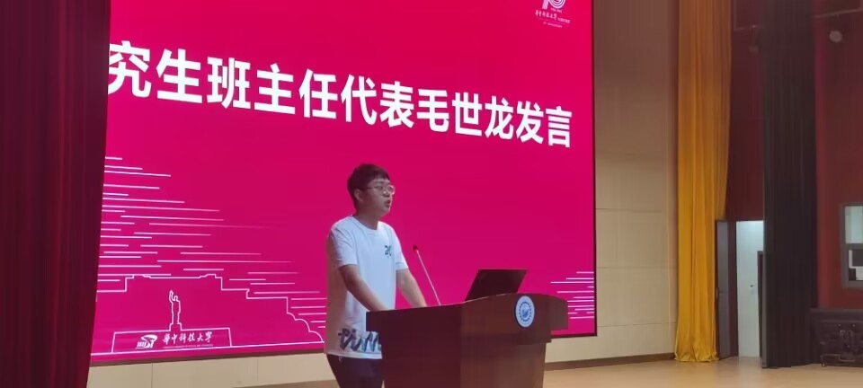 研究生班主任代表毛世龙分享了大学四年学生生活的经历,他建议同学们从兴趣出发,找到合适的道路,要勇于尝试,不必担心结果的好坏。最后他表示会努力做好同学们的纽带,帮助同学们拥有一个快乐充实的大学生活。