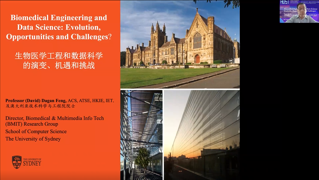 接下来,双边学者围绕生物医学与大数据应用开展专题研讨。冯大淦院士以“Biomedical Engineering and Data Science: Evolution, Opportunities and Challenges”生物医学工程和数据科学:演变、机遇与挑战)为题,介绍了生物医学工程和技术发展的四个阶段:CT(电子计算机断层扫描)和MRI(核磁共振)-纳米技术和组织工程-基因工程-生物科学与数据科学相结合,同时结合应用算法预测蛋白质结构发现乳腺癌的案例,生动地阐述了数据科学对生物医学工程技术发展的促进性。冯院士强调,前三个技术发展阶段的主要活动将在第四个阶段整合并持续活跃。