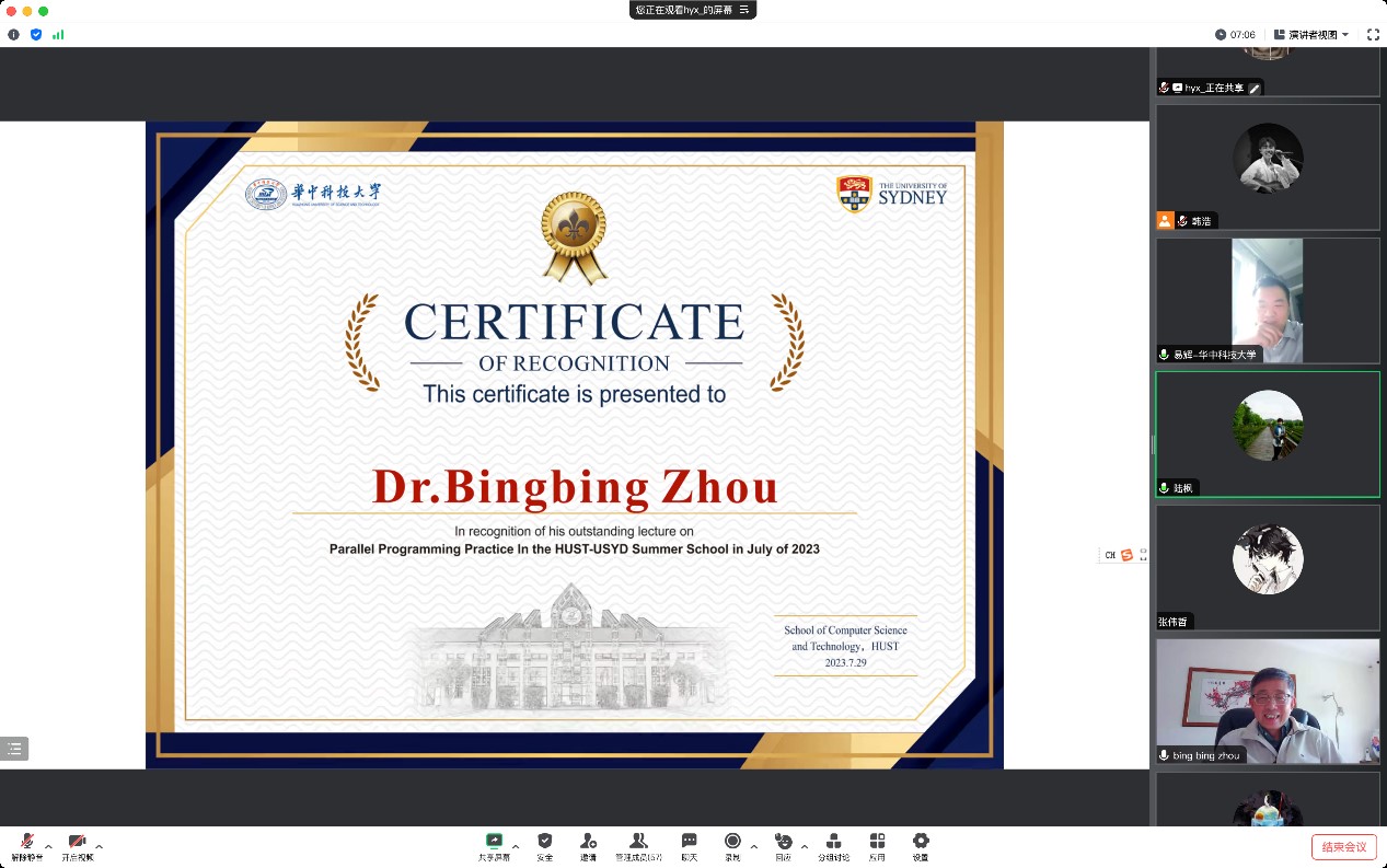 随后,易辉书记向周兵兵老师颁发课程项目授课证书,周兵兵分享了这次华中大-悉尼大学暑期学校的感想,对同学们在项目中的表现十分认可,随后向顺利完成课程学习的同学们颁发结课证书,公布优秀学员名单并线上授予证书,向顺利结业的同学表示祝贺。