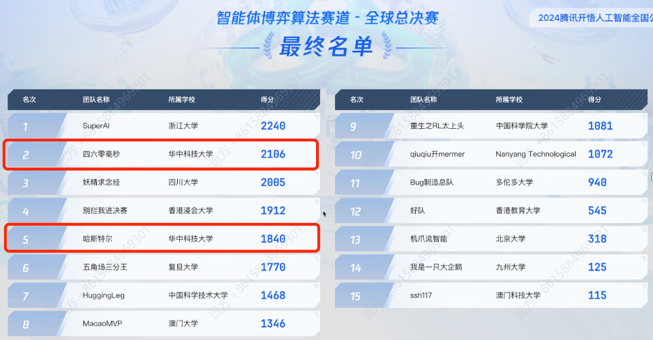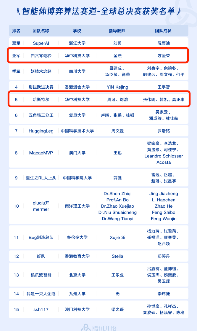 在本次大赛中,我院学子在智能体博弈算法赛道表现优异。其中,“四六零毫秒”战队在全球总决赛中斩获亚军,团队成员是方坚荣同学,指导教师是金燕副教授;“哈斯特尔”战队荣获第五名,团队成员是张伟明、韩凯、高正丰,指导教师是周可、刘渝。