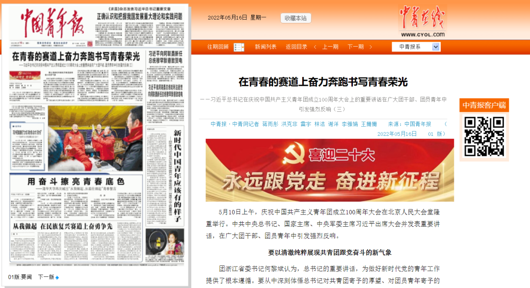 2022年5月16日《中国青年报》头版头条《在青春的赛道上奋力奔跑书写青春荣光》中刊发我院本科生夏天宇学习习近平总书记在庆祝中国共产主义青年团成立100周年大会上的重要讲话感想: