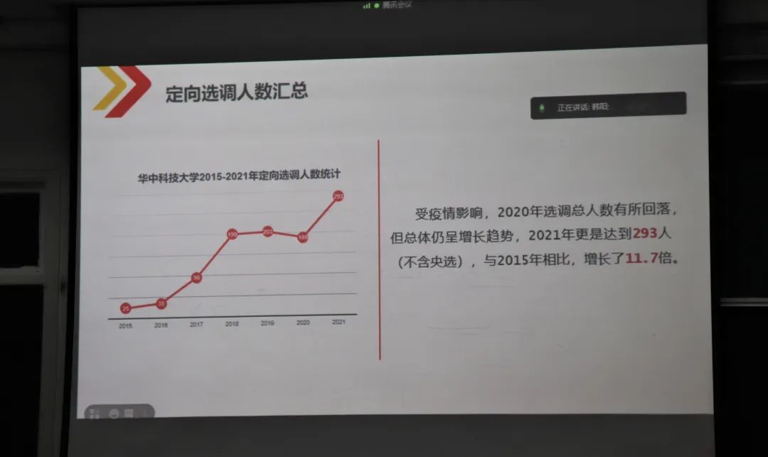 宁淼通过图表的形式对华中科技大学2015-2021年的选调生考取情况进行了分析。2015年至2021年间,除2020年相比2019年因疫情原因考取人数稍有回落外,我校历年考取人数整体上呈明显的上升趋势。