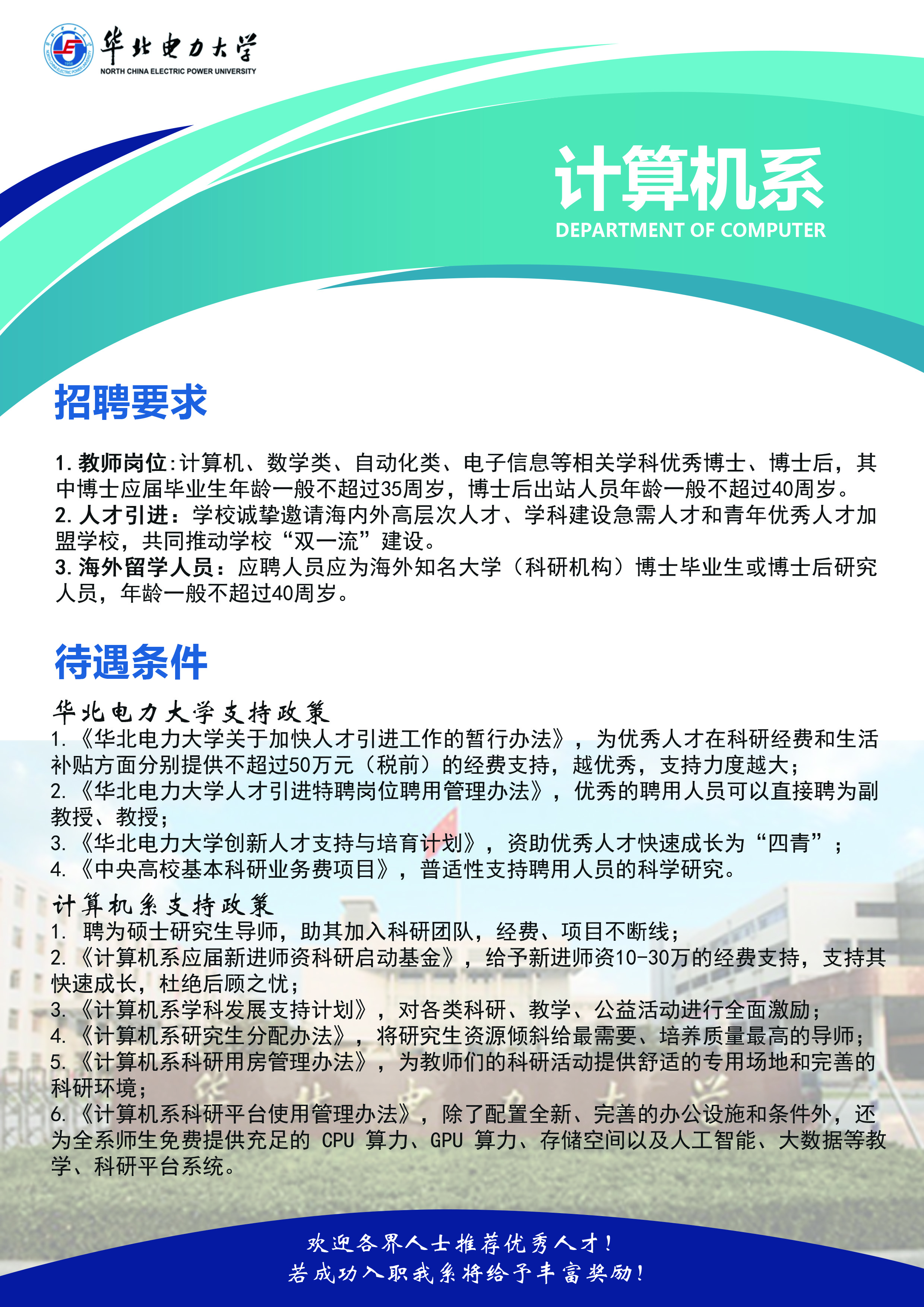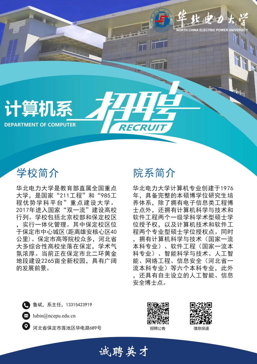 华北电力大学计算机系、电子与通信工程系招聘计算机、电子信息、集成电路、人工智能、信息安全、自动化、数学类等相关学科优秀博士、博士后。
