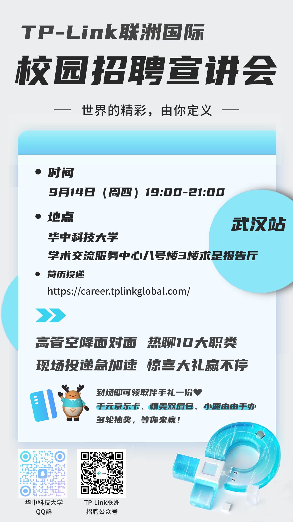 【专场宣讲会】TP-Link联洲国际武汉站宣讲会时间:9月14日(本周四)19:00-21:00地点:华中科技大学学术交流服务中心八号楼3楼求是报告厅时间:9月15日(本周五)14:30-16:30地点:武汉大学就业中心第二报告厅【关于我们】TP-Link联洲国际是引领行业技术发展的网络通信、消费电子、安防监控等多领域跨国科技公司,全球雇员超13000人。【投递链接】