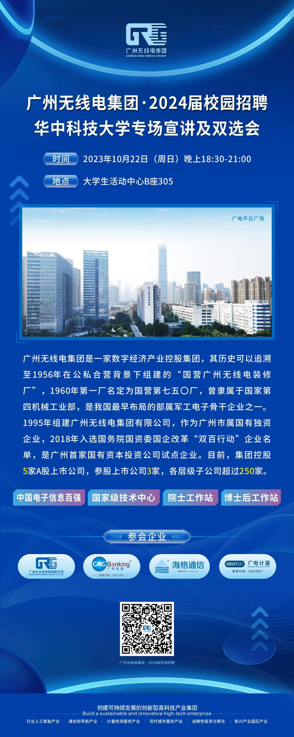 广州无线电集团2024校园招聘华中科技大学专场宣讲及双选会将于10月22日(周日)晚上18:30-21:00,在华中科技大学大学生活动中心B座305举行,集团总部及下属上市公司现场宣讲、现场面试,欢迎同学们来参加,“无线”未来,由你开启!