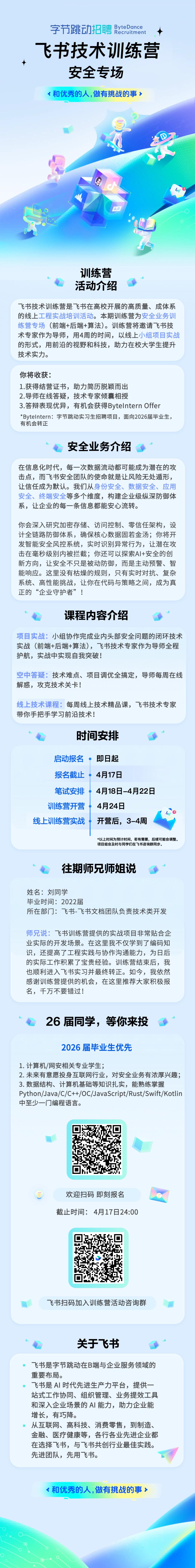 飞书技术训练营是飞书在高校开展的高质量、成体系的线上工程实战培训活动。本期训练营为安全业务训练营专场(前端+后端+算法)。训练营将邀请飞书技术专家作为导师,用4周的时间,以线上小组项目实战的形式,用前沿的视野和科技,助力在校大学生提升技术实力。