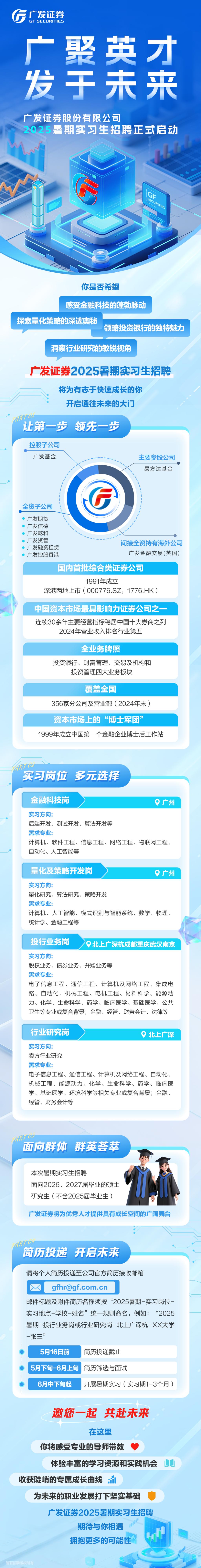 【简历投递,开启未来】请将个人简历投递至公司官方简历接收邮箱gfhr@gf.com.cn,邮件标题及附件简历名称须按“2025暑期-申请实习岗位-意向实习地点-学校-姓名”统一规则命名,例如:“2025暑期-投行业务岗或行业研究岗-北上广深杭-XX大学-张三”。