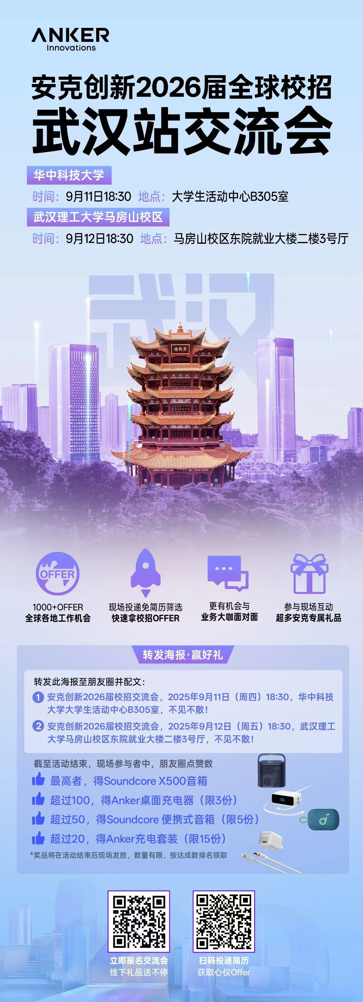 【线下福利】:参与交流会并现场投递,可免简历筛选,快速拿Offer;无数安克明星产品线下等你来拿