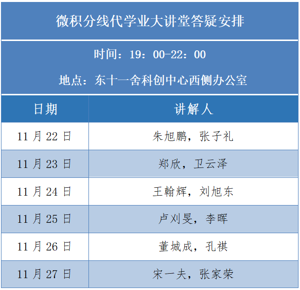 集中解答同学们的一些微积分具体问题,并分享备考微积分的相关经验。和学弟学妹们一同讨论如何快速适应大学生活以及如何高效合理分配时间的问题。最后为对未来的发展感到迷茫的学弟学妹们提供个人建议与指导。